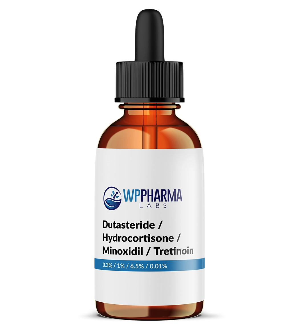 This topical solution for men combines dutasteride, hydrocortisone, minoxidil, and tretinoin in a formulation intended to address hair thinning and hair loss. Each ingredient has a distinct mechanism of action related to hair follicle biology, inflammation, and scalp processes. The formulation is designed to support follicle activity and overall scalp condition.