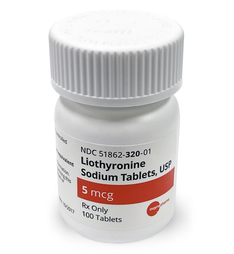 Liothyronine is synthetically produced to act in a manner similar to the endogenous thyroid hormone triiodothyronine. It is available as an oral tablet and is intended for use as replacement or adjunctive therapy in the management of hypothyroidism. The human body produces two primary thyroid hormones: thyroxine (T4) and triiodothyronine (T3), with T3 being the more biologically active form. T3 has a faster onset of action than T4 and may be used in individuals who have limited conversion of T4 to T3.
